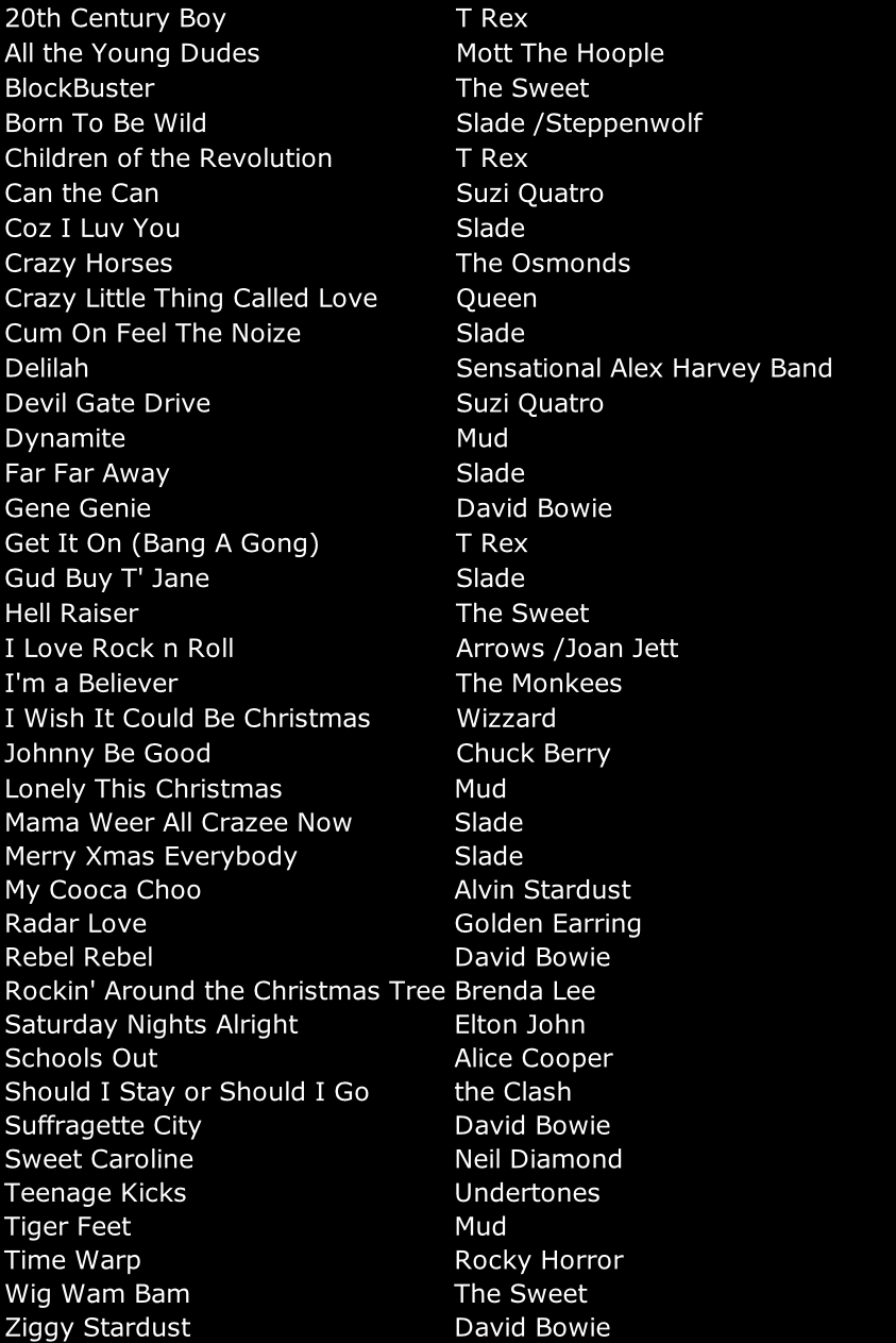 At a typical Slurred gig, you should expect to hear a good selection of classic glamtastic rock songs like these: